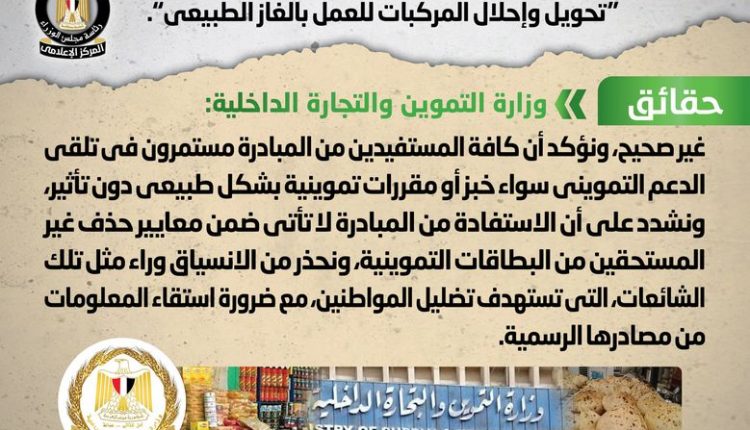 ونفت وزارة التموين والتجارة الداخلية تلك الأنباء، مُؤكدةً أنه لا صحة لإلغاء الدعم التمويني أو الخبز للمستفيدين من مبادرة “تحويل وإحلال المركبات للعمل بالغاز الطبيعي”، مُوضحةً أن كافة المستفيدين من المبادرة مستمرون في تلقي الدعم التمويني سواء خبز أو مقررات تموينية بشكل طبيعي دون تأثير، مُشددةً على أن الاستفادة من المبادرة لا تأتي ضمن معايير حذف غير المستحقين من البطاقات التموينية، مُحذرةً من الانسياق وراء مثل تلك الشائعات، التي تستهدف تضليل المواطنين، مع ضرورة استقاء المعلومات من مصادرها الرسمية.