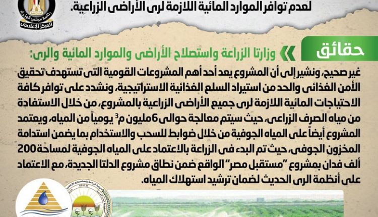 شائعة:عدم جدوى المشروع القومي “الدلتا الجديدة” نتيجة لعدم توافر الموارد المائية اللازمة لري الأراضي الزراعية