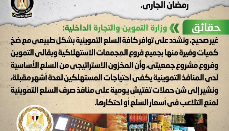 واكدت وزارة التموين والتجارة الداخلية أنه لا صحة لوجود عجز في أي من السلع التموينية خلال شهر رمضان الجاري، مُشددةً على توافر كافة السلع التموينية بشكل طبيعي مع ضخ كميات وفيرة منها بجميع فروع المجمعات الاستهلاكية وبقالي التموين وفروع مشروع جمعيتي، وأن المخزون الاستراتيجي من السلع الأساسية لدى المنافذ التموينية يكفي احتياجات المستهلكين لعدة أشهر مقبلة، مُشيرةً إلى شن حملات تفتيش يومية على منافذ صرف السلع التموينية لمنع التلاعب في أسعار السلع أو احتكارها.
