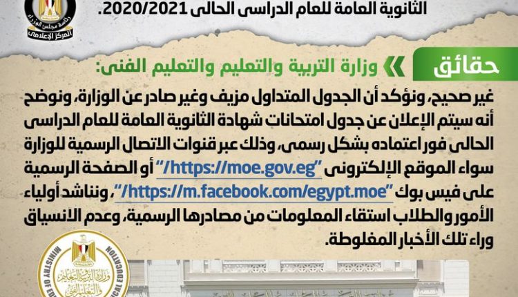 شائعة : تداول مواقع التواصل الاجتماعي جدول لامتحانات شهادة الثانوية العامة للعام الدراسي الحالي 2020/2021