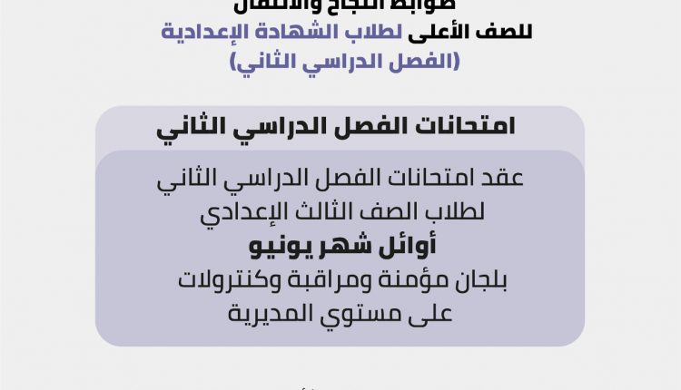 – تعقد امتحانات الفصل الدراسي الثاني لطلاب الصف الثالث الإعدادي أوائل شهر يونيو بلجان مراقبة ومؤمنة وكنترولات على مستوى الجمهورية وفق الاجراءات المتبعة.
