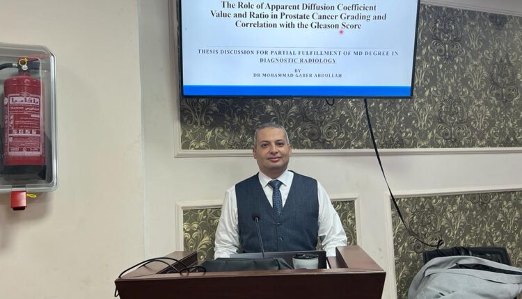 حصل الطبيب الباحث ” محمد جابر عبد الله محمد ” علي درجة الدكتوراة من كلية الطب البشري بجامعة بني سويف وذلك في الإنتشار الظاهري بسرطان البروستاتا وذلك في الرسالة المقدمة من الباحث تحت عنوان ” دور وقيمة ونسبة معامل الإنتشار الظاهري في سرطان البروستاتا وإرتباطه بنتيجة جليسون ” والذي يستخدم تقنيات الرنين المغناطيسي لتحديد الإنتشار الجزيئي لأورام البروستاتا وتحديد مراحلها لمساعدة المريض والطبيب في تحديد مراحل الورم وطرق علاجه