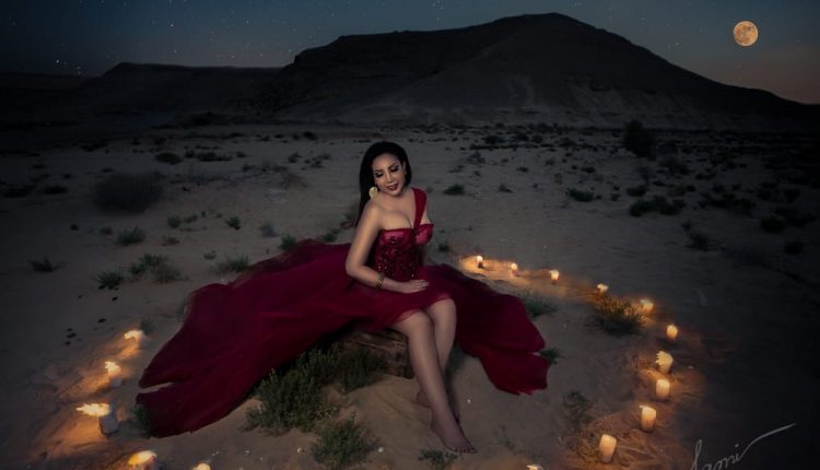 وظهرت رولا، بإطلالة صيفية ساحرة أنيقة بفستان أحمر الماروني مثير حافية القدمين في أحد المناطق الصحراوية التي ذينتها بالشموع.