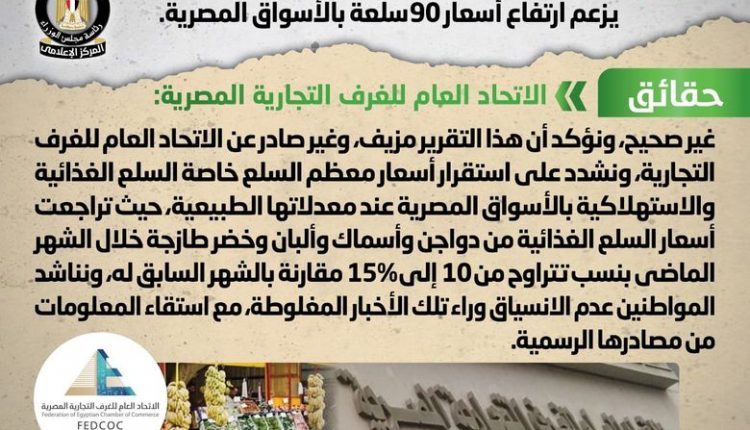 نفى المركز الإعلامي لمجلس الوزراء بالتواصل مع الاتحاد العام للغرف التجارية المصرية، انباء تداولتها بعض المواقع الإلكترونية وصفحات التواصل الاجتماعي تقريراً منسوباً للاتحاد العام للغرف التجارية يزعم ارتفاع أسعار 90 سلعة بالأسواق المصرية.
