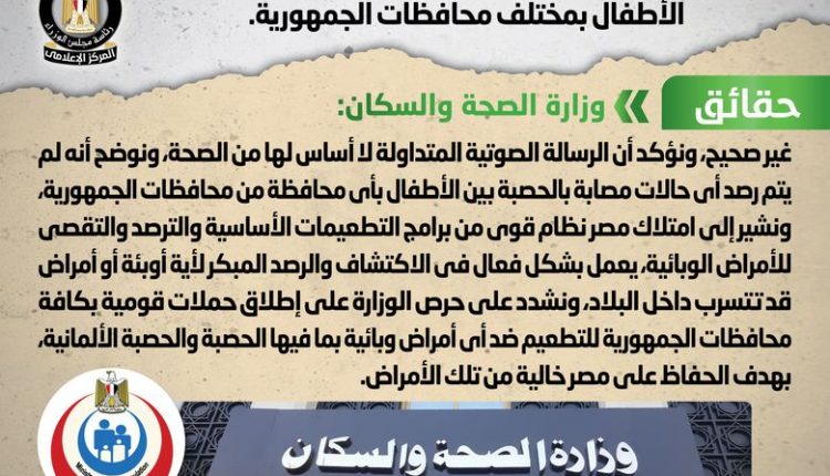 و نفت وزارة الصحة والسكان تلك الأنباء، مُؤكدةً أنه لا صحة للرسالة الصوتية المتداولة والتي تزعم انتشار مرض “الحصبة” بين الأطفال بأي من المحافظات على مستوى الجمهورية، وأن الرسالة الصوتية المتداولة لا أساس لها من الصحة، مُوضحةً أنه لم يتم رصد أي حالات مصابة بالحصبة بين الأطفال بأي محافظة من محافظات الجمهورية، مُشيرةً إلى امتلاك مصر نظام قوي من برامج التطعيمات الأساسية والترصد والتقصي للأمراض الوبائية، يعمل بشكل فعال في الاكتشاف والرصد المبكر لأية أوبئة أو أمراض قد تتسرب داخل البلاد، مُشددةً على حرص الوزارة على إطلاق حملات قومية بكافة محافظات الجمهورية للتطعيم ضد أي أمراض وبائية بما فيها الحصبة والحصبة الألمانية، بهدف الحفاظ على مصر خالية من تلك الأمراض.