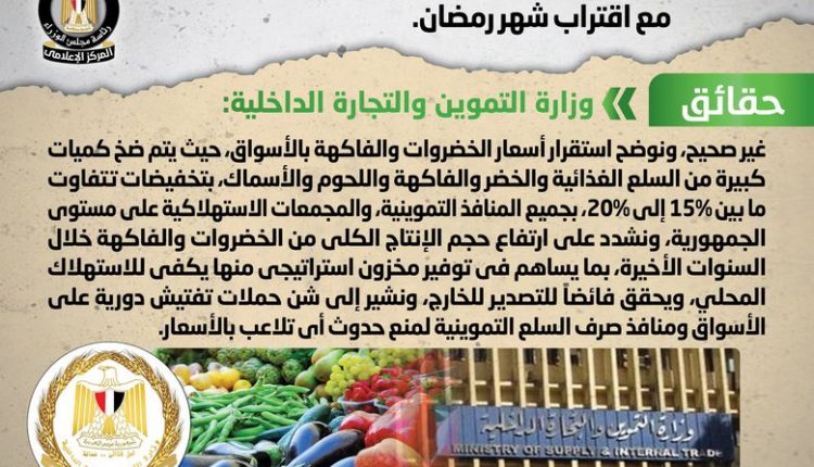 ومن جانبها اكدت وزارة التموين والتجارة الداخلية أنه لا صحة لارتفاع أسعار الخضروات والفاكهة بالأسواق تزامناً مع اقتراب شهر رمضان، مُوضحةً استقرار أسعار الخضروات والفاكهة بالأسواق، حيث يتم ضخ كميات كبيرة من السلع الغذائية والخضر والفاكهة واللحوم والأسماك، بتخفيضات تتفاوت ما بين 15% إلى 20%، بجميع المنافذ التموينية، والمجمعات الاستهلاكية على مستوى الجمهورية، مُشددةً على ارتفاع حجم الإنتاج الكلي من الخضروات والفاكهة خلال السنوات الأخيرة، بما يساهم في توفير مخزون استراتيجي منها يكفي للاستهلاك المحلي، ويحقق فائضاً للتصدير للخارج، مُشيرةً إلى شن حملات تفتيش دورية على الأسواق ومنافذ صرف السلع التموينية لمنع حدوث أي تلاعب بالأسعار.