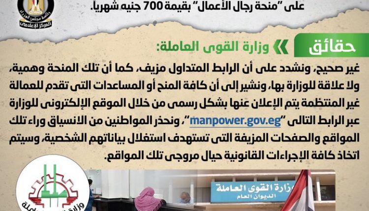 نفى المركز الإعلامي لمجلس الوزراء بالتواصل مع وزارة القوى العاملة،  انباء تداولتها بعض المواقع الإلكترونية وصفحات التواصل الاجتماعي بخصوص رابطاً جديداً لتسجيل بيانات العمالة غير المنتظمة للحصول على “منحة رجال الأعمال” بقيمة 700 جنيه شهرياً، واكدت ان  تلك الأنباء لا صحة لها ولا لإطلاق أي روابط جديدة لتسجيل بيانات العمالة غير المنتظمة للحصول على “منحة رجال الأعمال” بقيمة 700 جنيه شهرياً، مُشددةً على أن الرابط المتداول مزيف، كما أن تلك المنحة وهمية، ولا علاقة للوزارة بها، مُشيرةً إلى أن كافة المنح أو المساعدات التي تقدم للعمالة غير المنتظمة يتم الإعلان عنها بشكل رسمي من خلال الموقع الإلكتروني للوزارة عبر الرابط التالي”manpower.gov.eg”، مُحذرةً المواطنين من الانسياق وراء تلك المواقع والصفحات المزيفة التي تستهدف استغلال بياناتهم الشخصية، وسيتم اتخاذ كافة الإجراءات القانونية حيال مروجي تلك المواقع.
