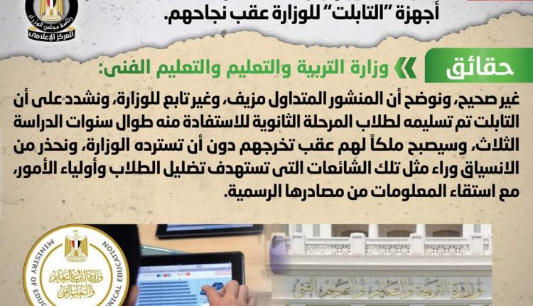 تداولت بعض المواقع الإلكترونية وصفحات التواصل الاجتماعي منشوراً بإلزام طلاب الشهادة الثانوية بتسليم أجهزة “التابلت” للوزارة عقب نجاحهم، وقد قام المركز الإعلامي لمجلس الوزراء بالتواصل مع وزارة التربية والتعليم والتعليم الفني، والتي نفت تلك الأنباء، مُؤكدةً أنه لا صحة للمنشور المتداول بشأن إلزام طلاب الشهادة الثانوية بتسليم أجهزة “التابلت” للوزارة عقب نجاحهم، مُوضحةً أن المنشور المتداول مزيف، وغير تابع للوزارة، مُشددةً على أن التابلت تم تسليمه لطلاب المرحلة الثانوية للاستفادة منه طوال سنوات الدراسة الثلاث، وسيصبح ملكاً لهم عقب تخرجهم دون أن تسترده الوزارة، مُحذرةً من الانسياق وراء مثل تلك الشائعات التي تستهدف تضليل الطلاب وأولياء الأمور، مع استقاء المعلومات من مصادرها الرسمية.