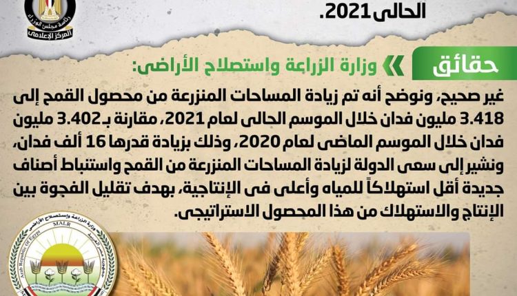 أُثير في بعض المواقع الإلكترونية وصفحات التواصل الاجتماعي أنباء بشأن تراجع المساحة المنزرعة من القمح خلال العام الحالي2021، وقد قام المركز الإعلامي لمجلس الوزراء بالتواصل مع وزارة الزراعة واستصلاح الأراضي، والتي نفت تلك الأنباء، مُؤكدةً أنه لا صحة لتراجع المساحة المنزرعة من القمح خلال العام الحالي 2021، مُوضحةً أنه تم زيادة المساحات المنزرعة من محصول القمح إلى 3.418 مليون فدان خلال الموسم الحالي لعام 2021، مقارنة بـ 3.402 مليون فدان خلال الموسم الماضي لعام 2020، وذلك بزيادة قدرها 16 ألف فدان، مُشيرةً إلى سعي الدولة لزيادة المساحات المنزرعة من القمح واستنباط أصناف جديدة أقل استهلاكاً للمياه، وأعلى في الإنتاجية، بهدف تقليل الفجوة بين الإنتاج والاستهلاك من هذا المحصول الاستراتيجي.