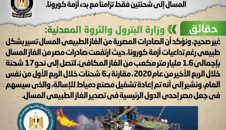 مُؤكدةً أنه لا صحة لتراجع عدد الشحنات المصرية المُصدرة من الغاز الطبيعي المسال إلى شحنتين فقط تزامناً مع بدء أزمة كورونا، مُوضحةً أن الصادرات المصرية من الغاز الطبيعي المسال تسير بشكل طبيعي رغم تداعيات أزمة كورونا، حيث ارتفعت صادرات مصر من الغاز المسال بإجمالي 1.6 مليار متر مكعب من الغاز المكافئ، لتصل إلى نحو 17 شحنة خلال الربع الأخير من عام 2020، مقارنة بـ 6 شحنات خلال الربع الأول من نفس العام، مُشيرةً إلى أنه تم إعادة تشغيل مصنع دمياط للإسالة، والذي سيسهم في جعل مصر إحدى الدول الرئيسية في تصدير الغاز الطبيعي المسال.
