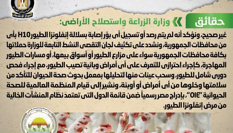 و نفت وزارة الزراعة واستصلاح الأراضي تلك الأنباء، مُؤكدةً أنه لا صحة لظهور بؤر جديدة من فيروس إنفلونزا الطيور H10 في مصر، ولم يتم رصد أو تسجيل أي بؤر إصابة بسلالة إنفلونزا الطيور H10 بأي من محافظات الجمهورية، مُشددةً على تكثيف لجان التقصي النشط التابعة للوزارة حملاتها بكافة محافظات الجمهورية سواء على مزارع الطيور أو أسواق بيعها، أو مسارات الطيور المهاجرة، كإجراء احترازي للتعرف على أي أمراض وبائية تصيب الطيور، مع إجراء فحص دوري شامل للطيور، وسحب عينات منها لتحليلها بمعمل بحوث صحة الحيوان للتأكد من سلامتها وخلوها من أي أمراض أو أوبئة، مُشيرةً إلى قيام المنظمة العالمية للصحة الحيوانية “OIE”، بإدراج مصر رسمياً ضمن قائمة الدول التي تعتمد نظام المنشآت الخالية من مرض إنفلونزا الطيور.