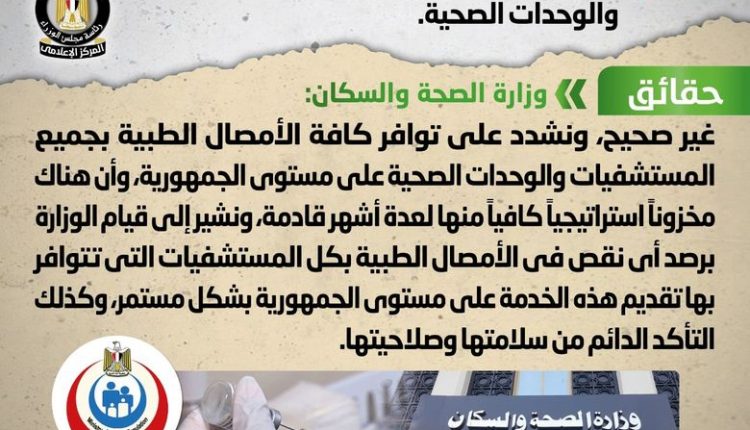 نفى المركز الإعلامي لمجلس الوزراء بالتواصل مع وزارة الصحة والسكان،أنباء انتشرت في بعض المواقع الإلكترونية وصفحات التواصل الاجتماعي بشأن نقص الأمصال الطبية بالمستشفيات الحكومية والوحدات الصحية.