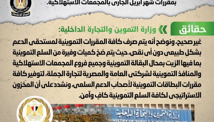 نفى المركز الإعلامي لمجلس الوزراء بالتواصل مع وزارة التموين والتجارة الداخلية،انباء انتشرت في بعض المواقع الإلكترونية وصفحات التواصل الاجتماعي بشأن نقص حصة الزيت الموزعة للفرد على البطاقات التموينية بمقررات شهر أبريل الجاري بالمجمعات الاستهلاكية.