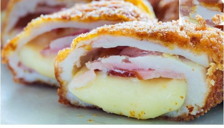 – تفرد قطع الدجاج المتبل، وتوضع عليها مرتديلا اللحم المدخن.