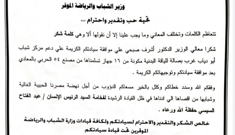 كما نص خطاب مركز الشباب علي خالص الشكر والتقدير والاحترام لوزير الشباب والرياضة ولكافة قيادات وزارة الشباب والرياضة الموقرين تحت قيادته