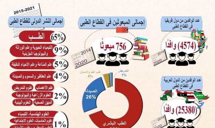 وفيما يتعلق بالابتعاث أوضح التقرير أن إجمالى المبعوثين فى القطاع الطبى خلال الفترة من (2014-2020) بلغ 756 مبعوثًا موزعة على النحو التالى: (69% طب بشرى، 26% صيدلة، 4% طب الفم والأسنان، 1% تمريض).